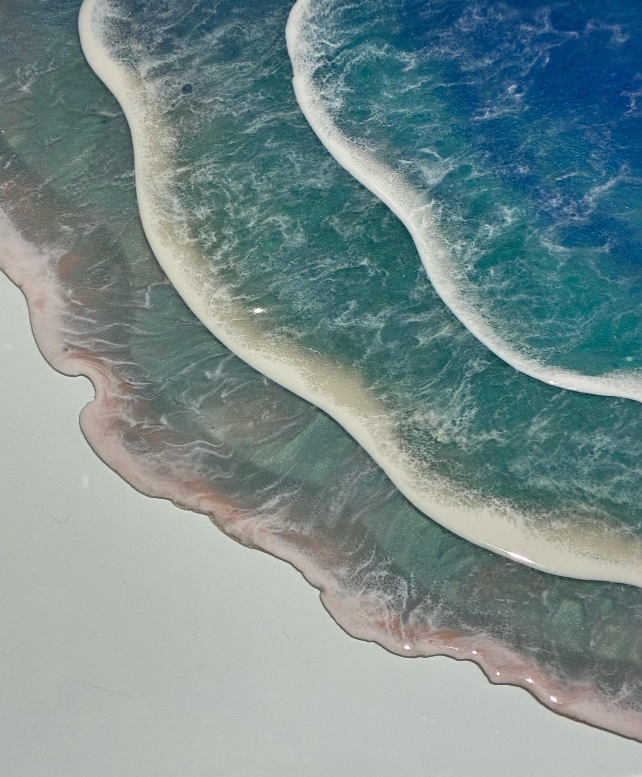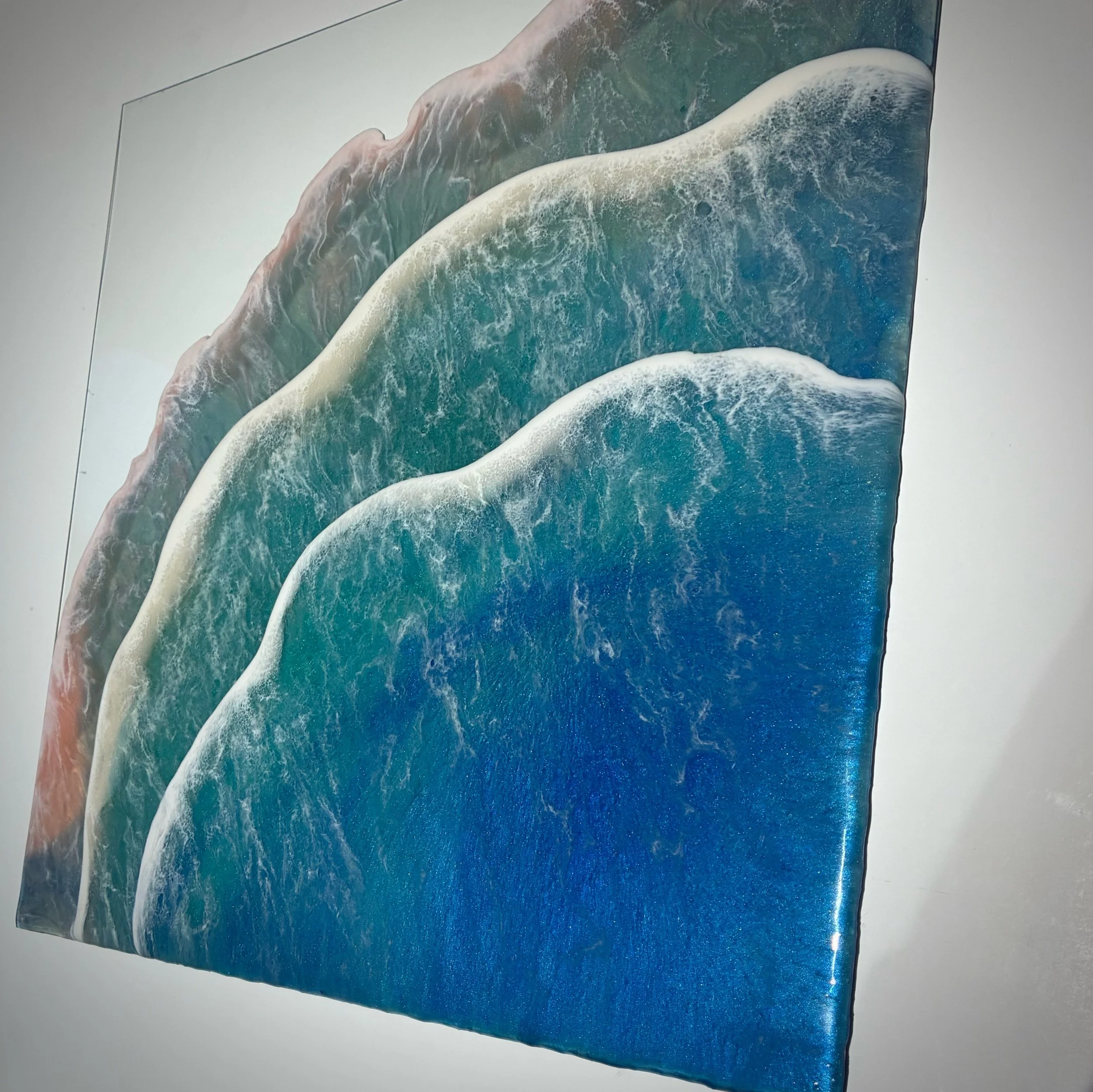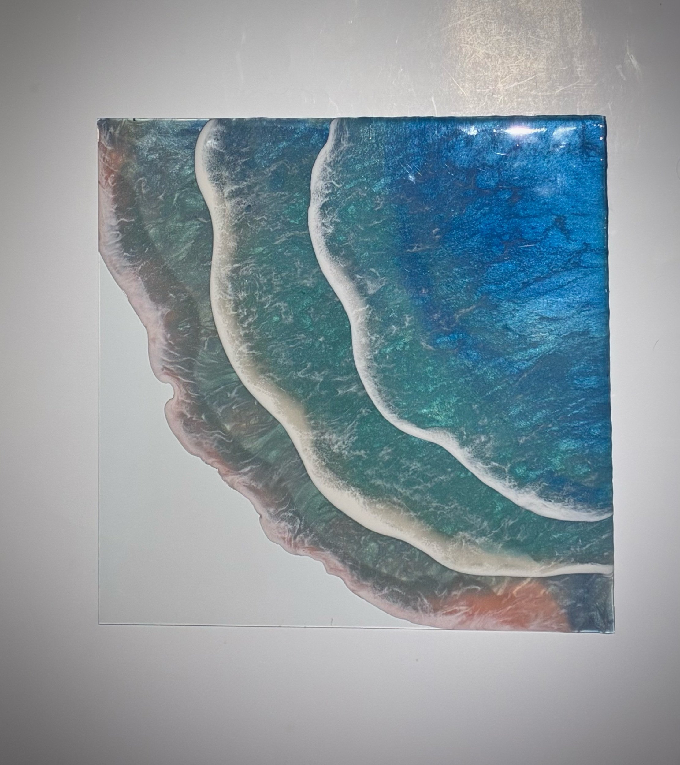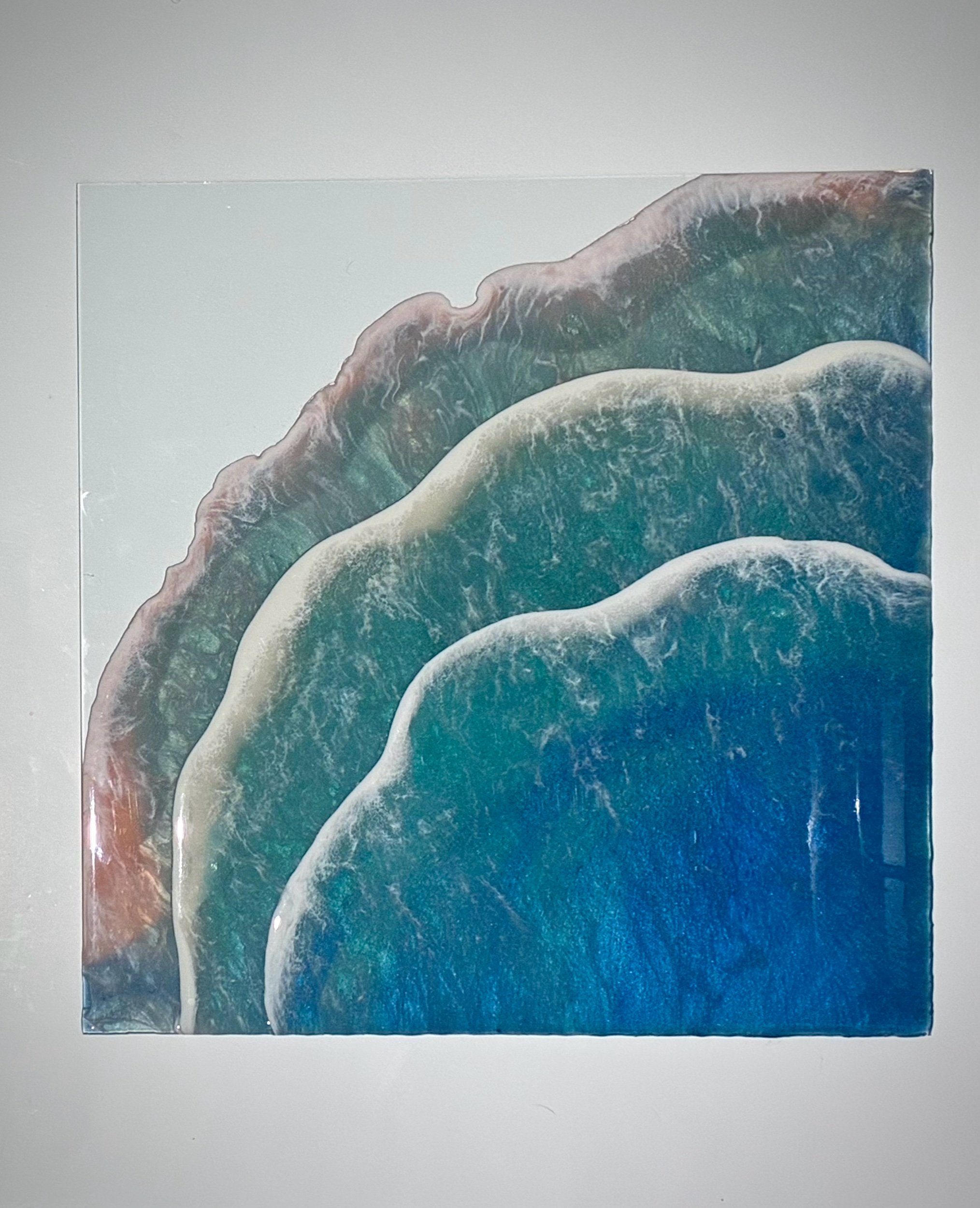 These delicate warm waves will warm up any home! Poured on a 15” glass panel, this piece transforms with various backgrounds. The glass portion will take on the color of your wall or if desired you could mount coloured paper to the back to customize the look you want.